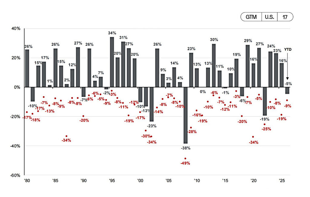 Despite average intra-year drops of 14.2%, annual returns were positive in 35 of 46 years