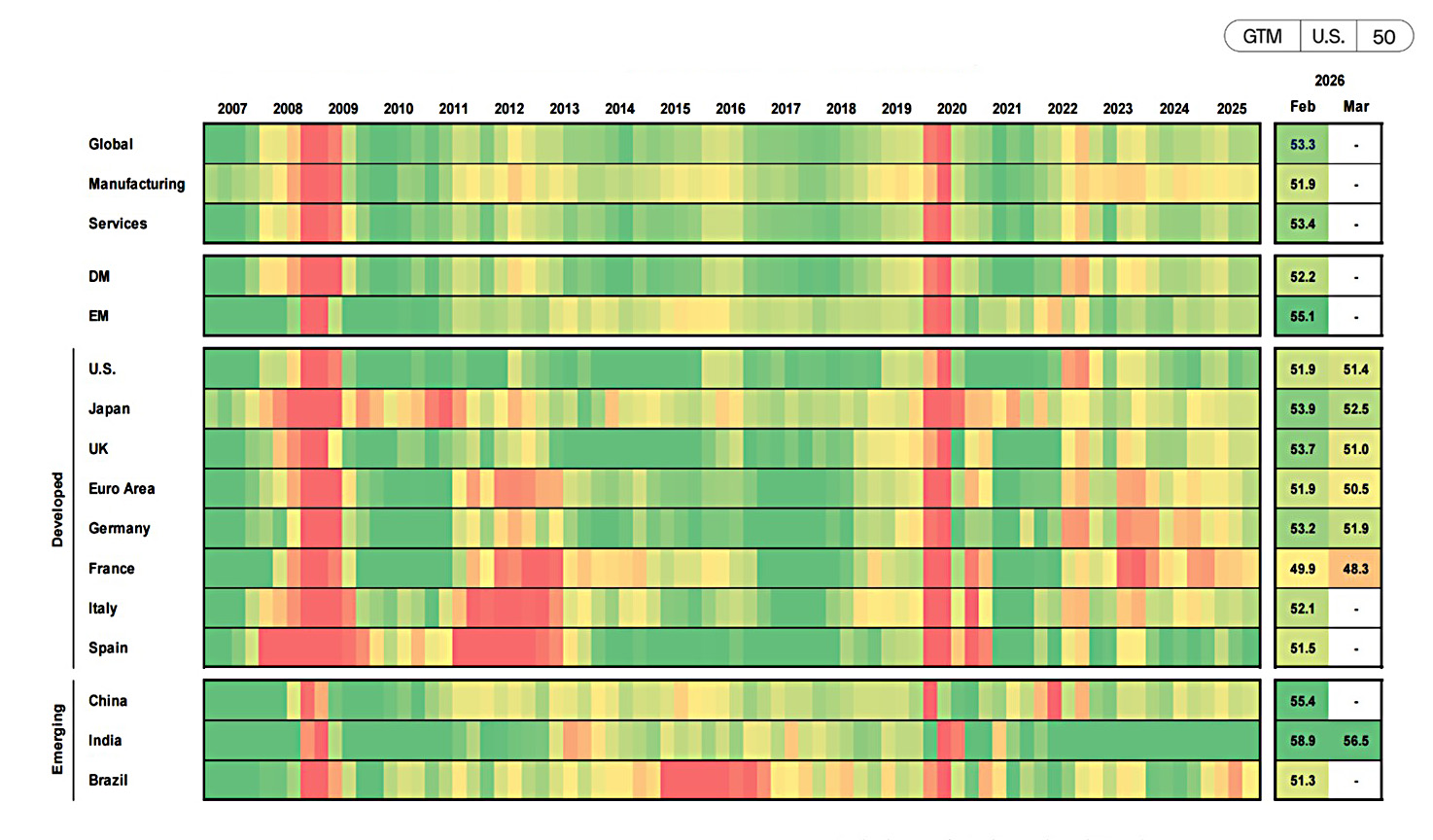 Source: J.P. Morgan Economic Research, Standard & Poor’s, J.P. Morgan Asset Management. Any italicized figures represent estimates by J.P. Morgan Asset Management. The Composite PMI includes both manufacturing and services sub-indices. Heatmap colors are based on PMI relative to the 50 level, which indicates acceleration or deceleration of the sector, for the period shown. Heatmap is based on quarterly averages, except for the two most recent figures, which are single month readings. Data for the U.S. are back-tested and filled in for 2007 to 2009. Data for Japan are back-tested and filled in for the first two quarters of 2007. DM and EM represent developed markets and emerging markets, respectively. Guide to the Markets – U.S. Data are as of March 31, 2026.