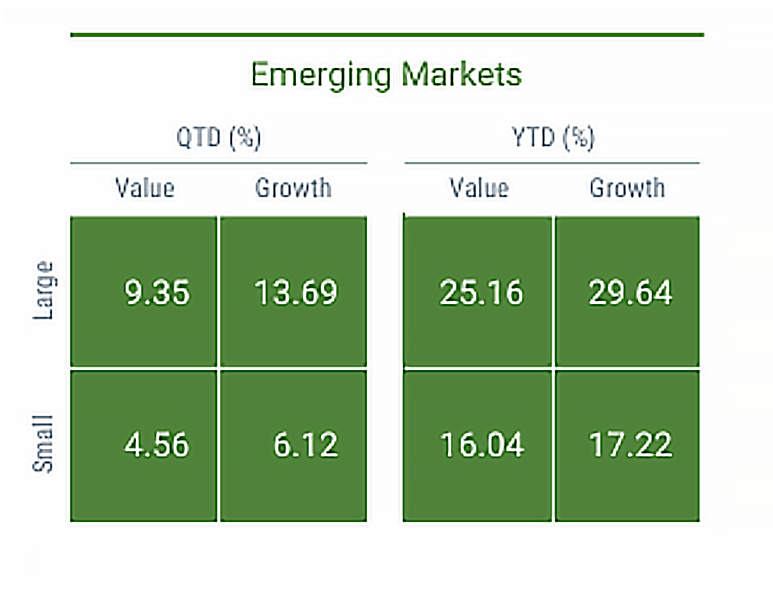 The broad emerging markets stock index outperformed developed markets stocks for the quarter and year-to-date period. The index gained nearly 11% for the quarter and almost 28% year-to-date.
