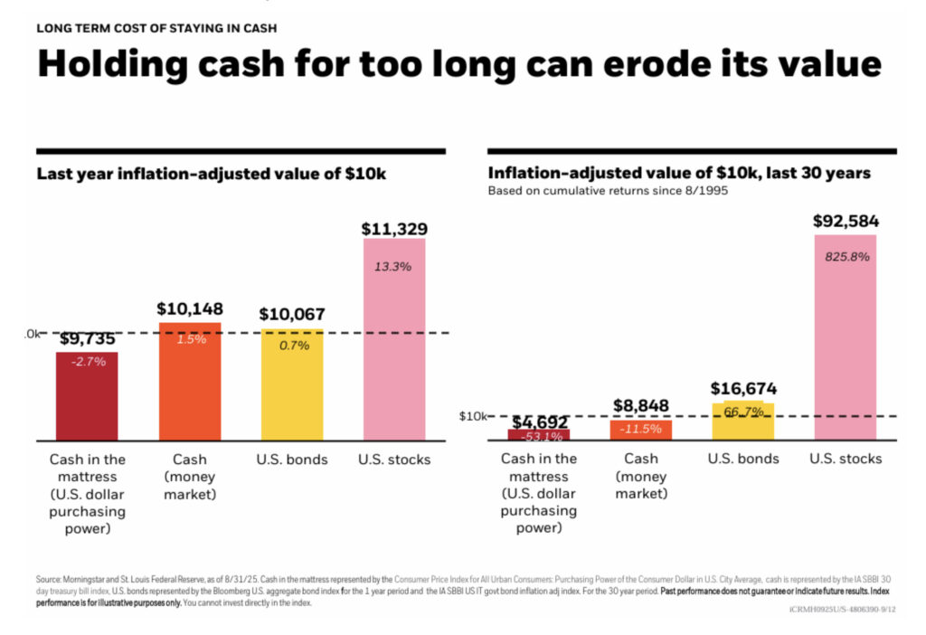 For long-term investors, the data underscores the cost of staying in cash: over 30 years, $10,000 invested in stocks grew to more than $92,584, while cash held under the mattress barely reached $4,692 after inflation.
