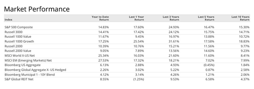 Small-cap stocks outperformed large-caps for the quarter and year to date. Small-caps gained nearly 30% for the year-to-date period, while large-caps gained 25%.