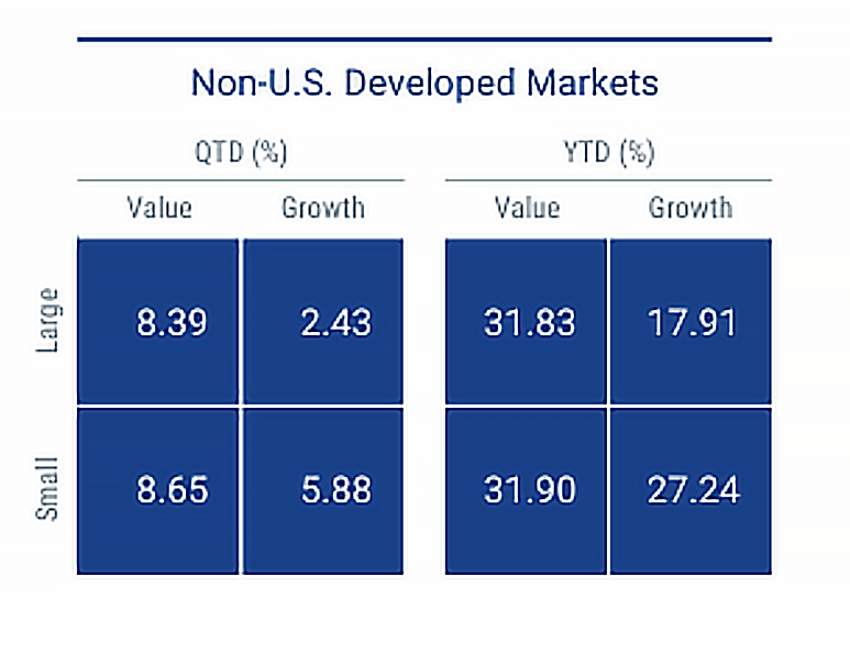 Non-U.S. developed markets stocks underperformed U.S. stocks for the quarter but outperformed year to date. All major size and style indices advanced for both periods.