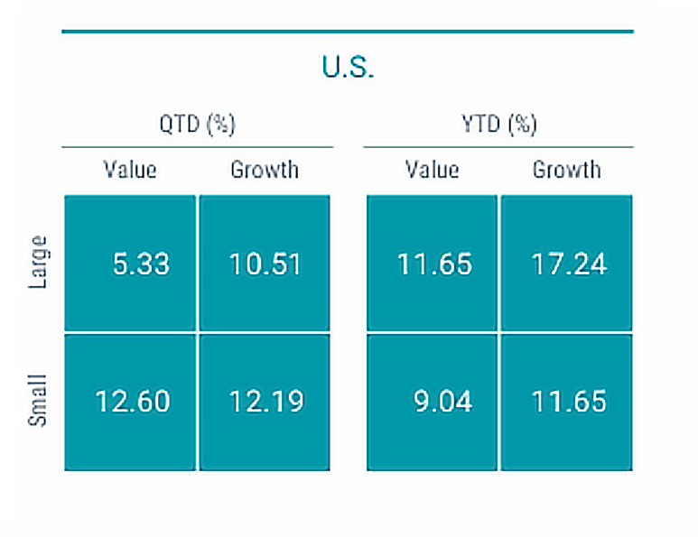 For the quarter, growth stocks outperformed their value peers among large-caps but lagged among small-caps. Year to date, growth stocks outperformed across the board.